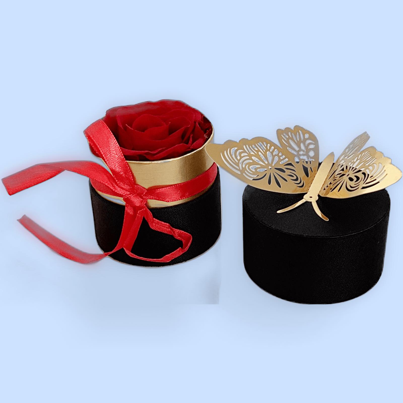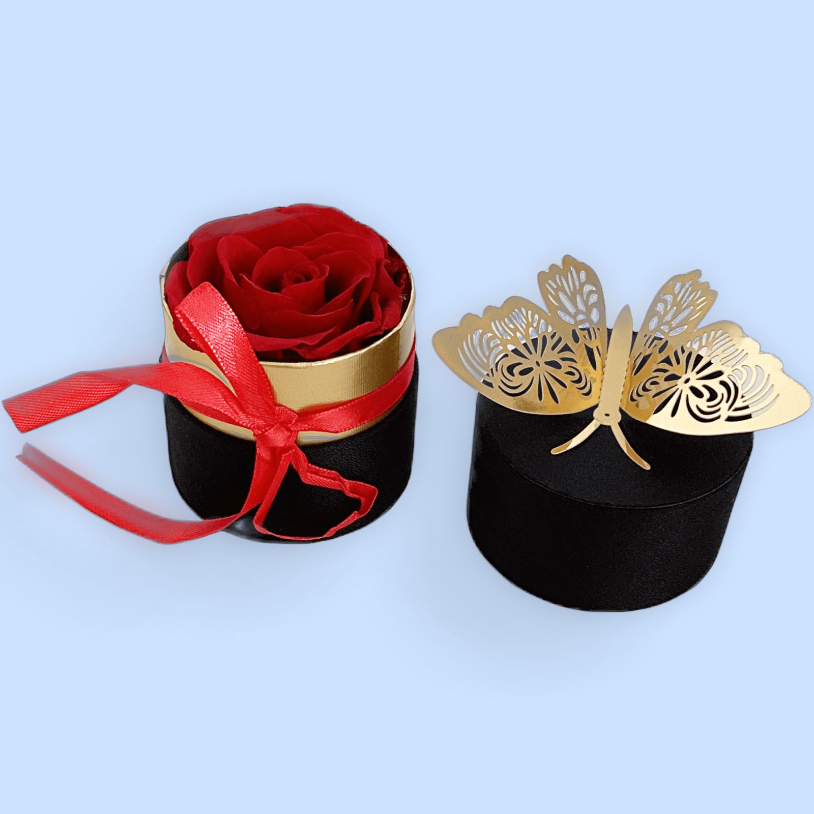 The “Forever Rose Charm” is a beautifully preserved rose nestled in an elegant black and gold box, adorned with a delicate red ribbon and a golden butterfly accent. This eternal bloom symbolizes everlasting love and beauty, making it the perfect gift for special occasions or to add a touch of romance to any space. Thoughtfully designed, it combines luxury and sentiment in a stunning presentation.