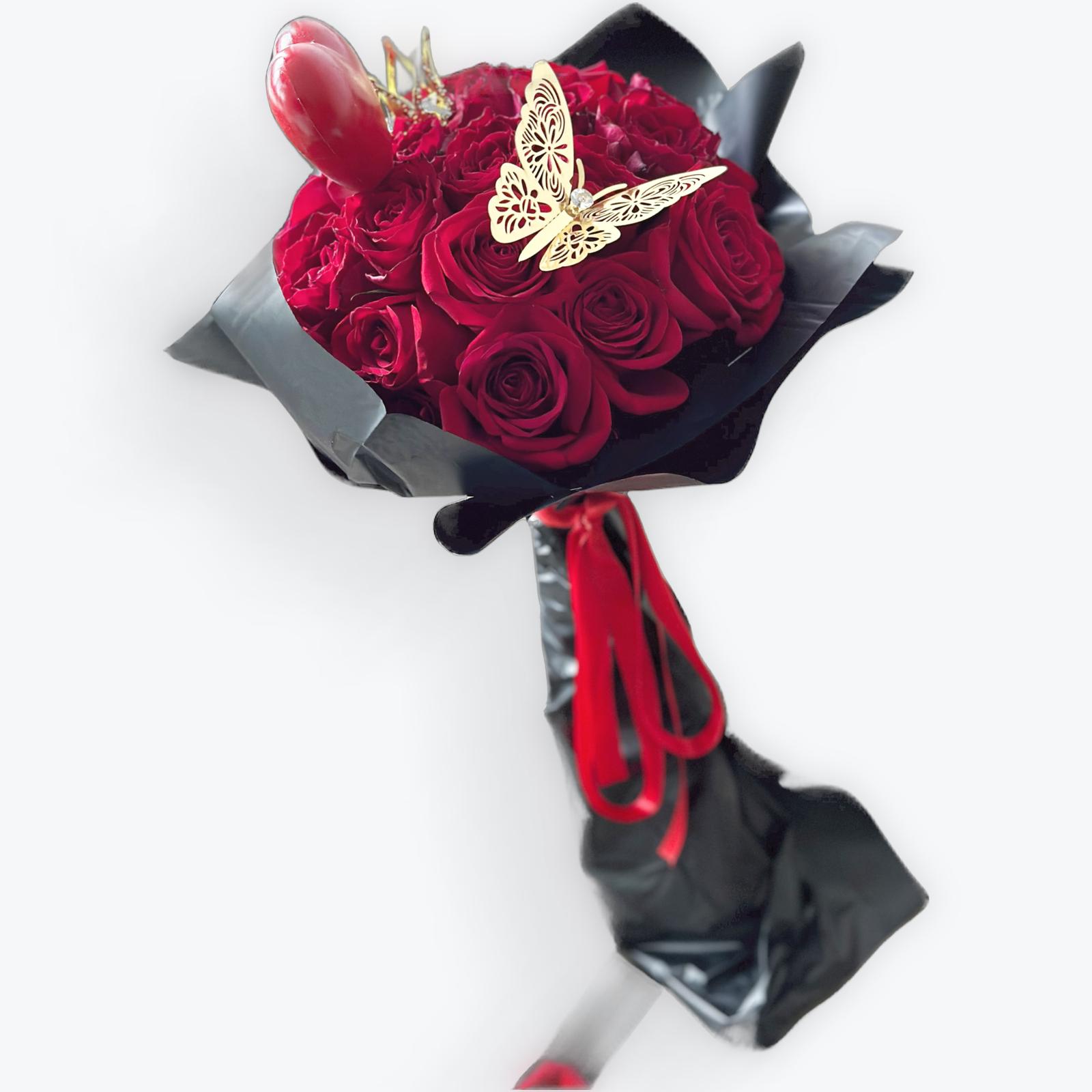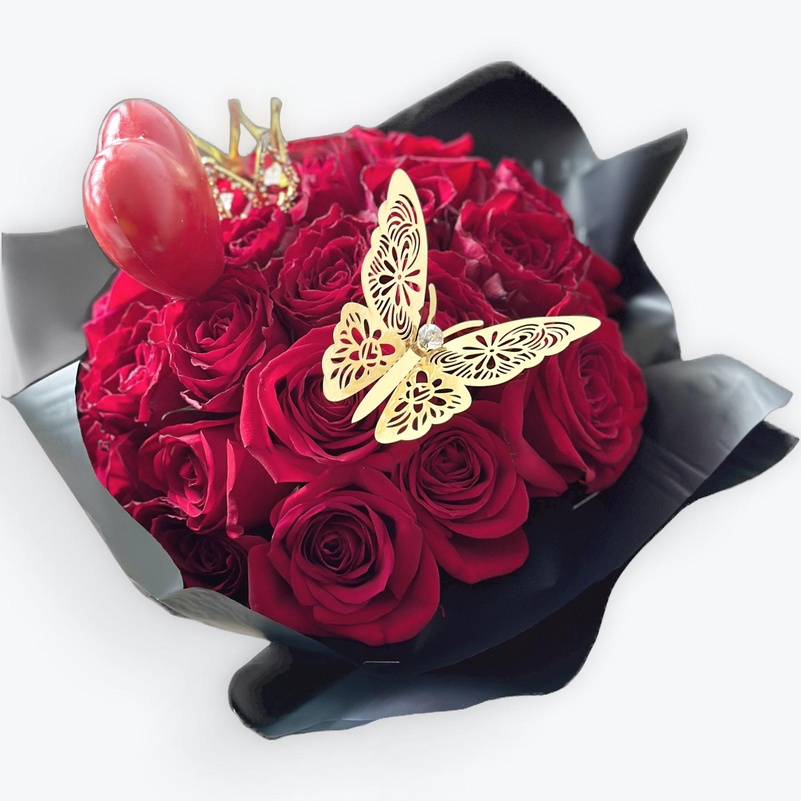 A striking bouquet of deep red roses wrapped in sleek black wrapping, adorned with golden butterfly ornaments and a heart-shaped accent. This luxurious bouquet is perfect for making a bold statement of love and passion.