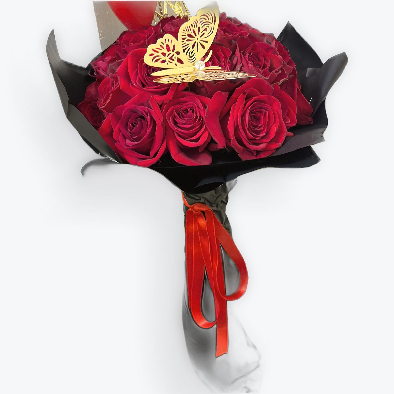 An elegant bouquet of red roses, golden butterflies, and a heart-shaped accent, wrapped in sophisticated black. Ideal for special romantic moments!
